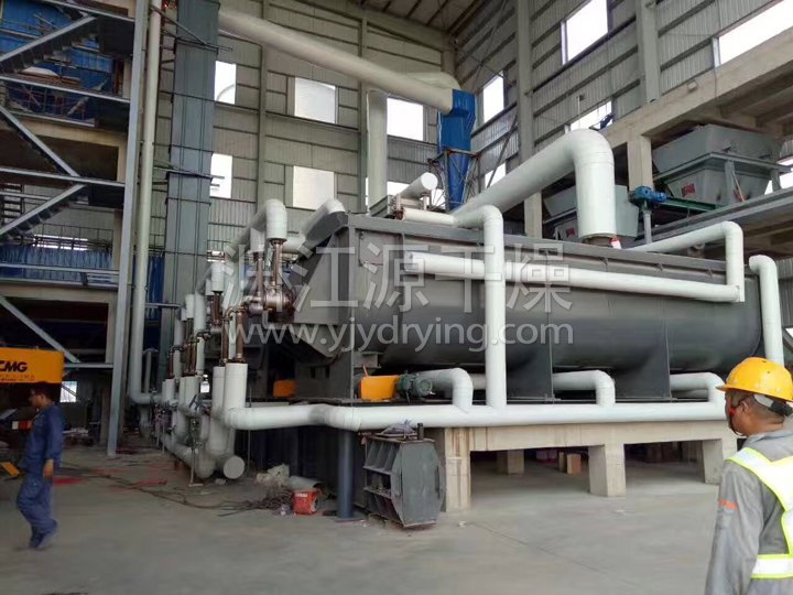 在漿葉及夾套通入蒸汽加熱的同時(shí),出料口上部同時(shí)通入經(jīng)過(guò)加熱后的干空氣進(jìn)一步干燥,這樣大大增加了設(shè)備的干燥強(qiáng)度。蒸發(fā)出來(lái)的水分由尾氣帶出干燥機(jī),經(jīng)過(guò)布袋除塵器過(guò)濾,將干燥后的細(xì)粉回收下來(lái),濕空氣由水除塵后引風(fēng)機(jī)排出室外。